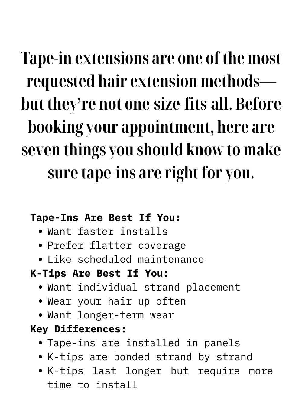 Tape-in extensions are one of the most requested hair extension methods—but they’re not one-size-fits-all. Before booking your appointment, here are seven things you should know to make sure tape-ins are right for you.